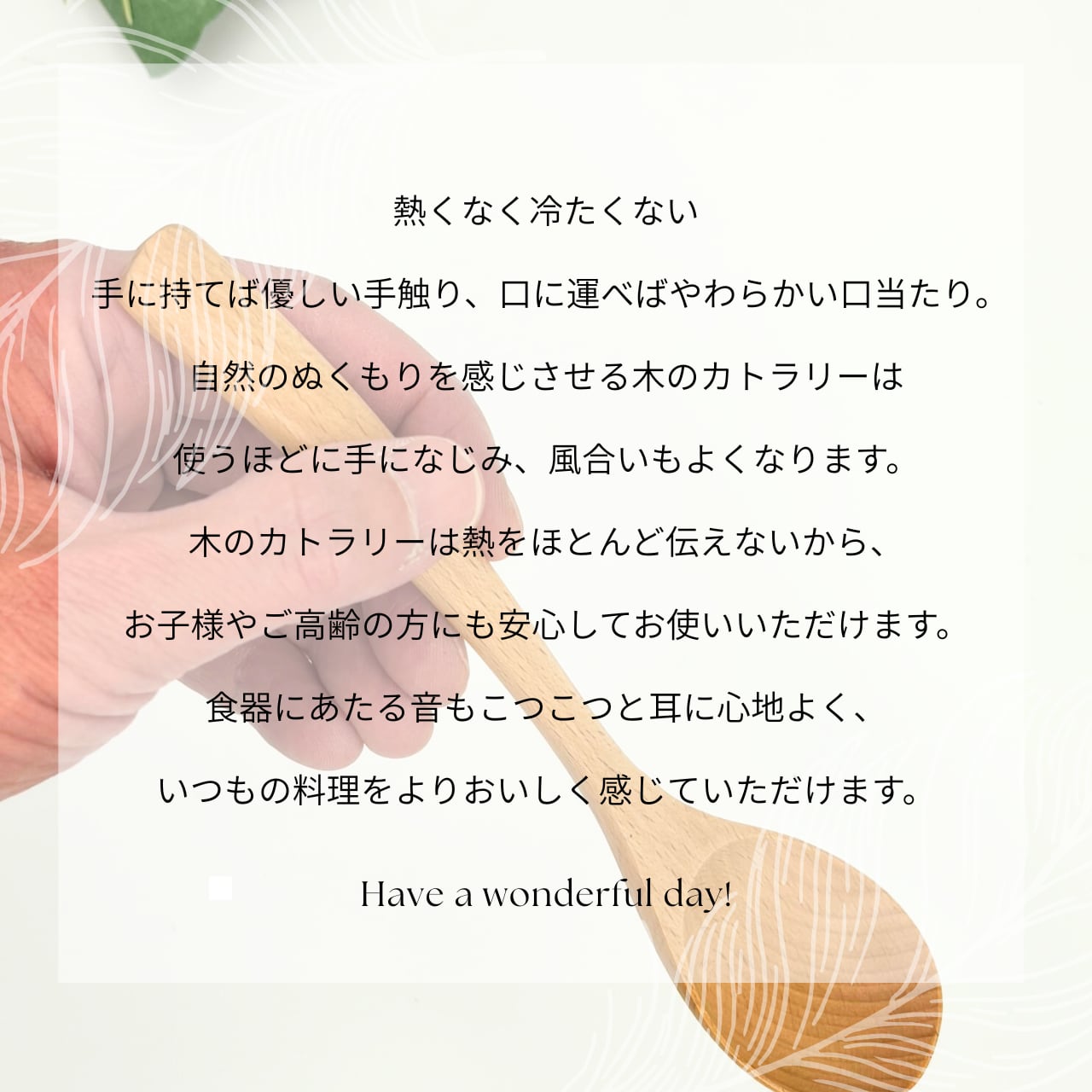 天然木を使用した、やさしい口当たりの木製カトラリーです。