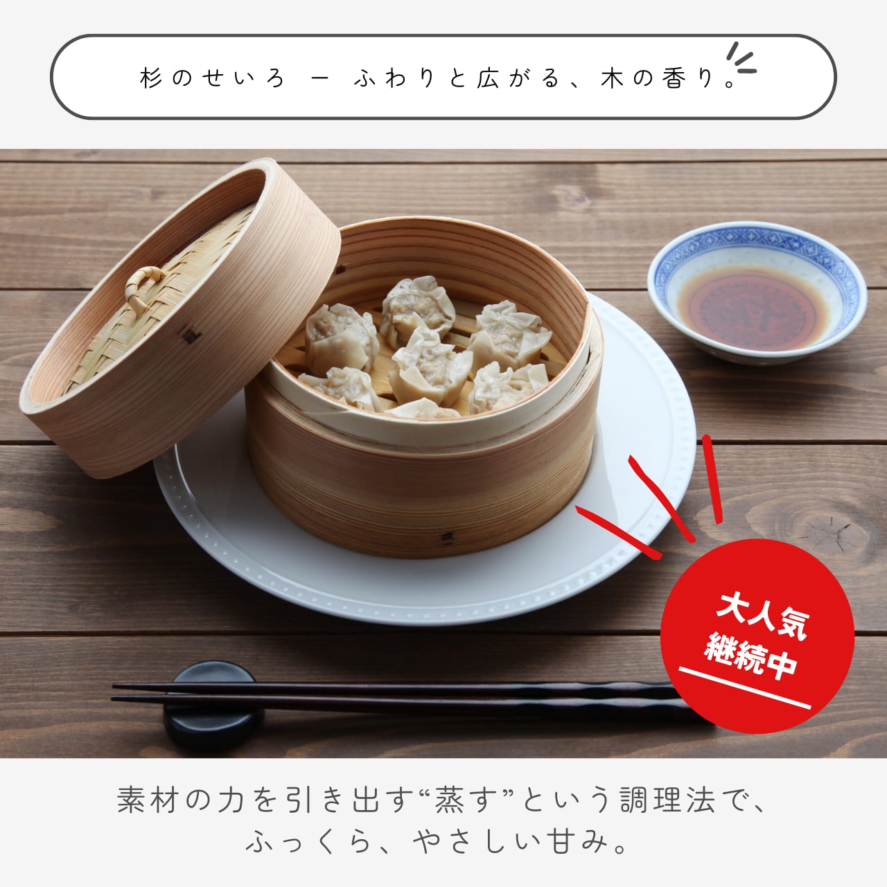 この2段セイロをご利用いただくことで、家庭でも本格的な蒸し料理を楽しむことができます。杉の木の香りが広がりながら、美味しい蒸し物を召し上がっていただけます。